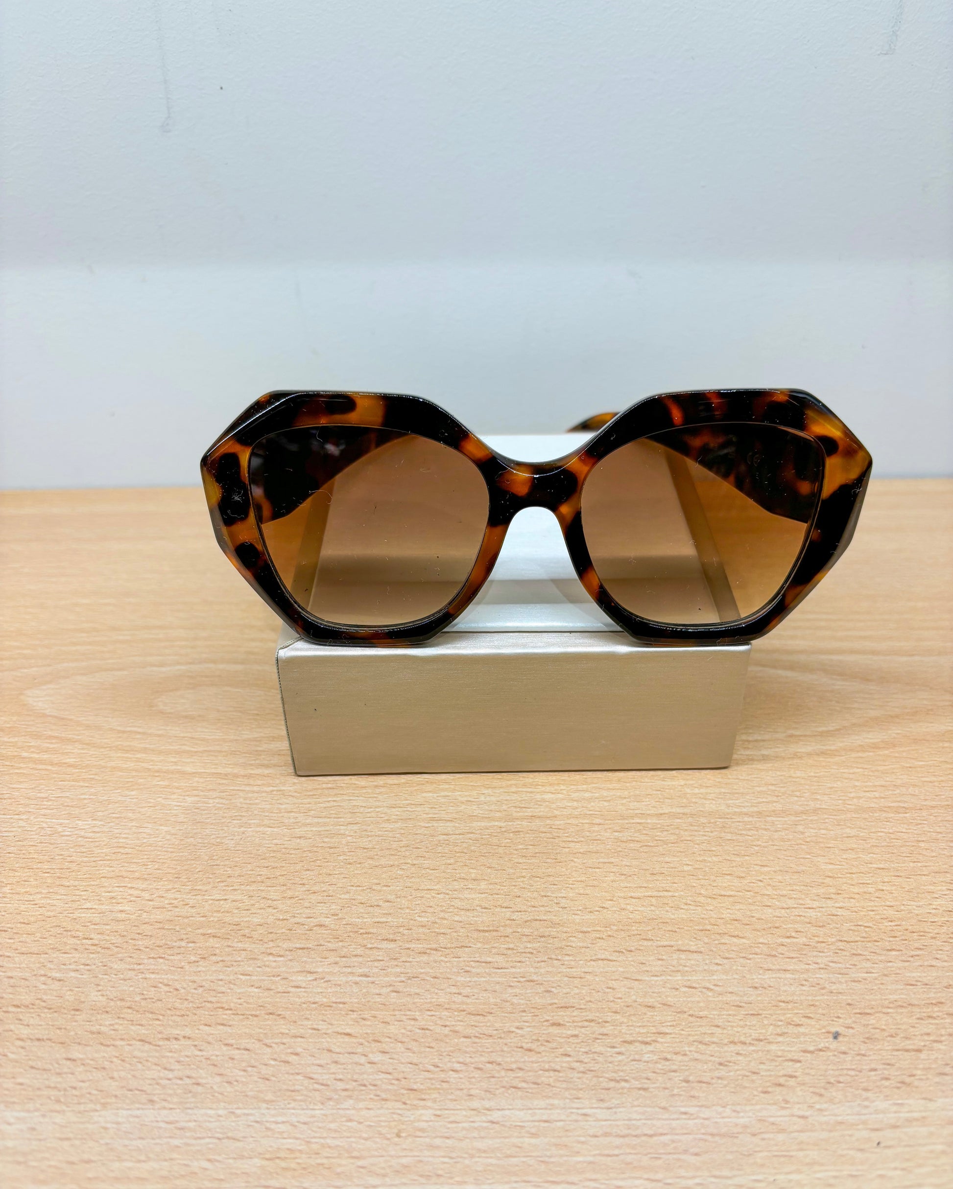 Gafas de sol irregulares con lentes de color caramelo y montura grande en color print. Diseñadas para uso en exteriores.